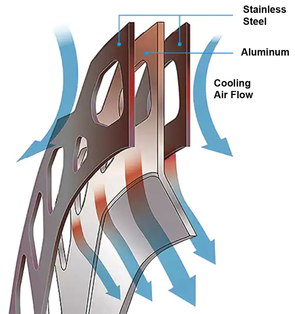 一方、外層のステンレススチール(熱伝導率 約17 W/mK)は、ブレーキパッドとの摩擦に耐える高い耐久性と適切な摩擦係数を提供する。この異種金属の組み合わせにより、単一素材のローターでは達成が難しい、優れた放熱性と耐久性の両立を実現している。