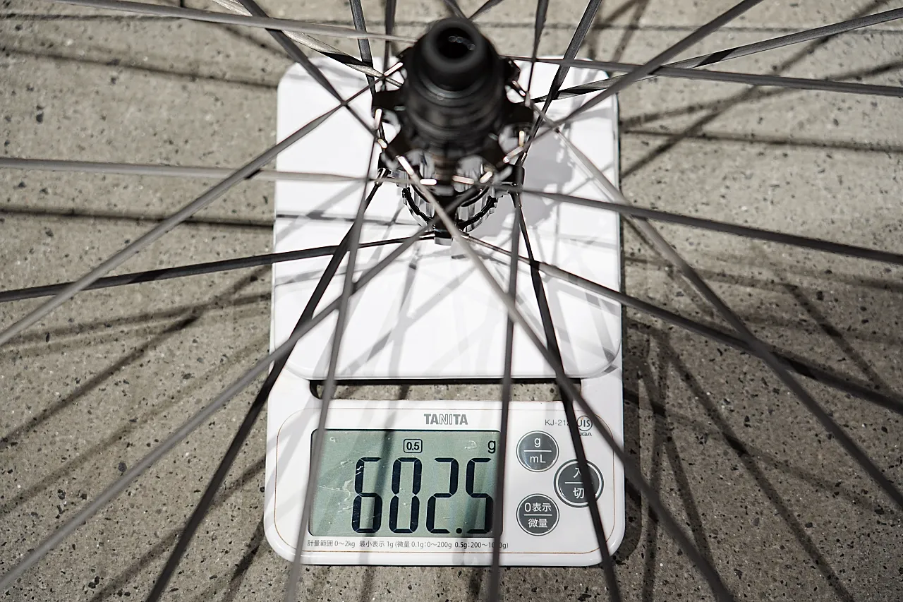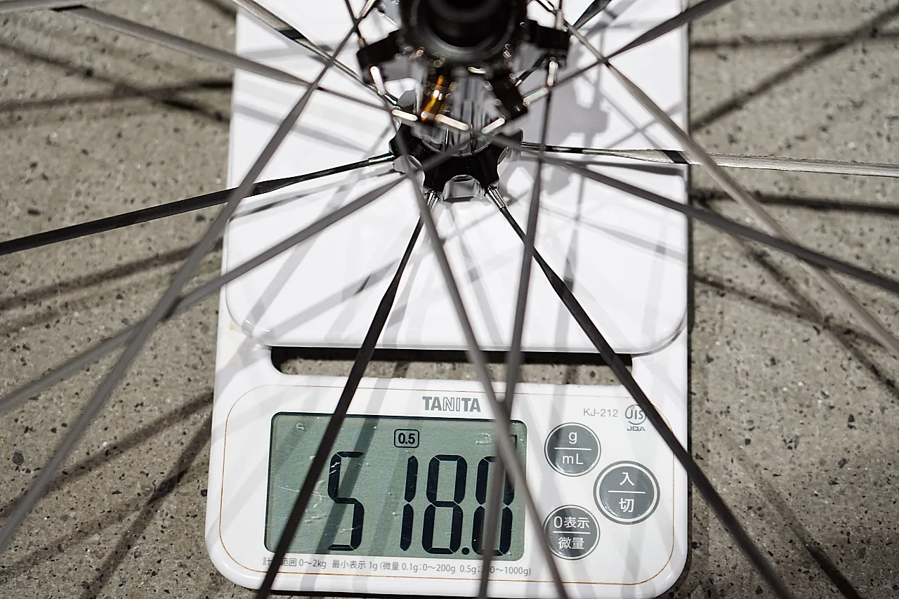 実測重量は、フロントが518g、リアが602gで合計1,120gだ。なんとカタログ重量よりも11g軽いが、この重量はチューブレスバルブx2とリムテープx2を含む重量である。すべての部品を外した状態では1,100gほどになる。