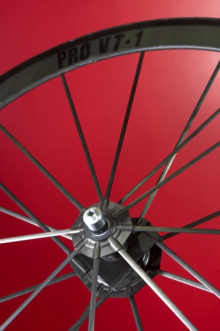 剛性の高いリムがパワー伝達のロスを最小限に抑え、鋭い加速性能を実現する一方で、スポーク自体が持つコンプライアンスがリムと共に路面からの衝撃をいなし、トラクションと快適性を向上させる。VONOAの名前は刻印されていないが、現状このカーボンスポークを作れるのは少数だ。