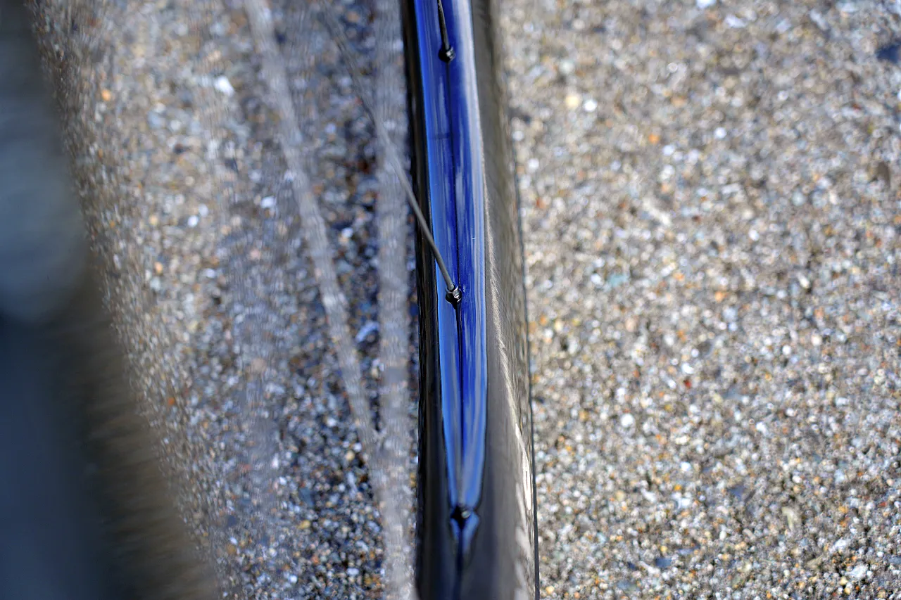 このスポークは、単に軽いだけでなく、高い剛性と、後述する特有のコンプライアンスを併せ持つ。このユニークな特性の組み合わせが、Ultralightリムの持つ「しなやかさ」と相乗効果を生み出す。手で曲げると「グニャリ」と簡単にしなる。