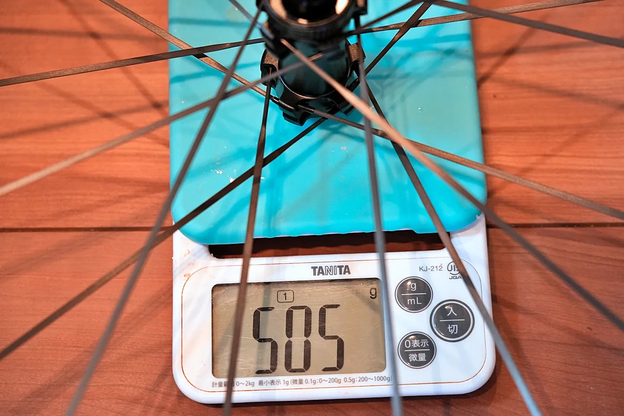 50mmハイトで1,100gという圧倒的な軽量性がウリのRCXだが、ホイール重量のほとんどが外周に集中している。リムが390g~400gだとすると、72%が外周部分の重量であることがわかる。重量がホイールの中心に集中していると軽快に回転するが、逆に外周部分に重量が移動してしまうと回すときに重さを感じる。