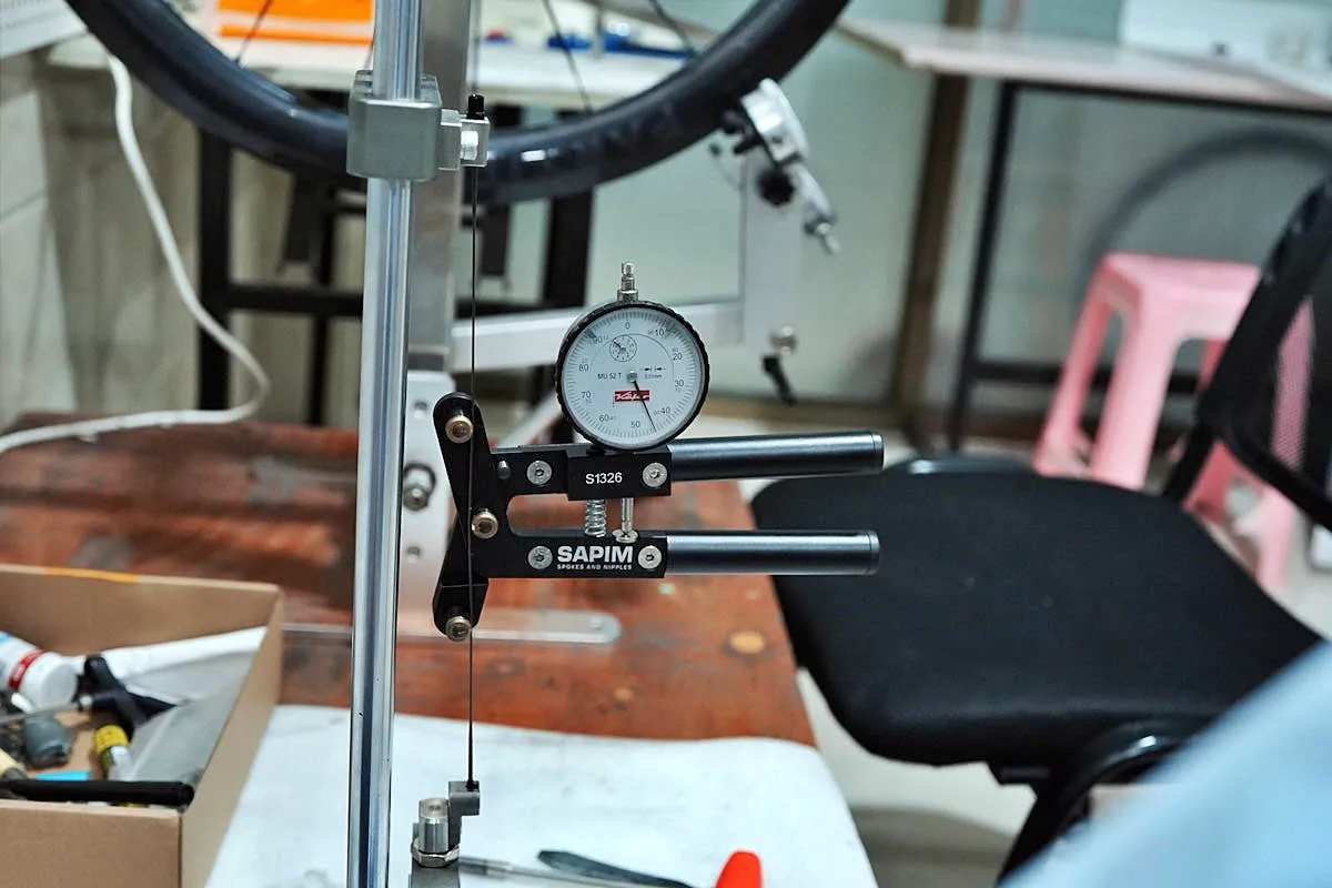 - 振れ取りと応力除去: ホイールの振れを横・縦ともに0.25mm以内に収める。さらに、スポークテンションを安定させ、初期の振れを防ぐために、応力除去(ストレスリリービング)と再振れ取りを行う。