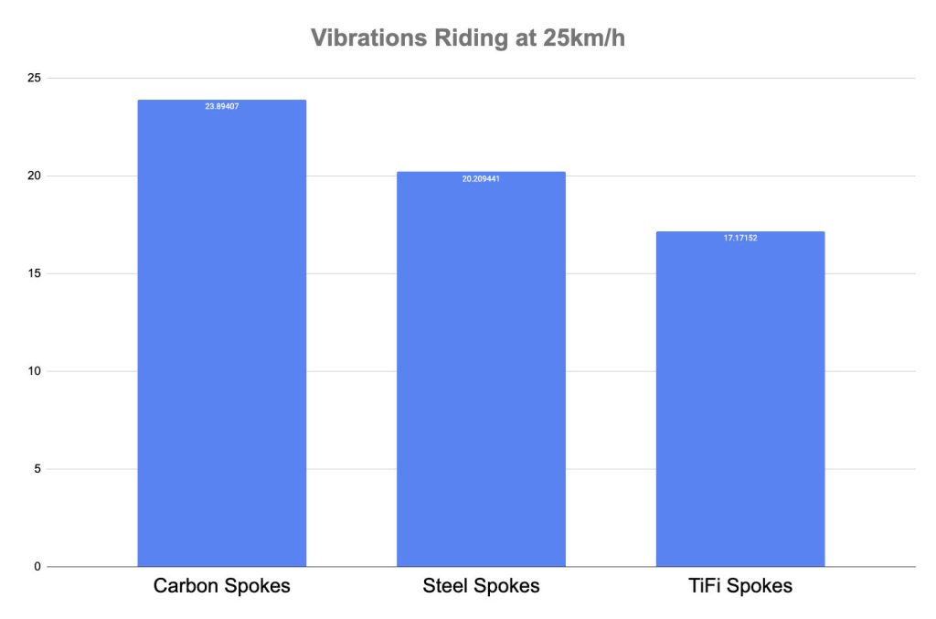 Panda Podiumの分析によれば、Ti-Fiスポークはスチールスポークと比較して「35%多く変形する(35% more deformation)」。すなわち、Ti-Fiスポークの剛性は、スチールよりも約35%低く、カーボンと比較すると半分以下(約53%低い)ということになる。