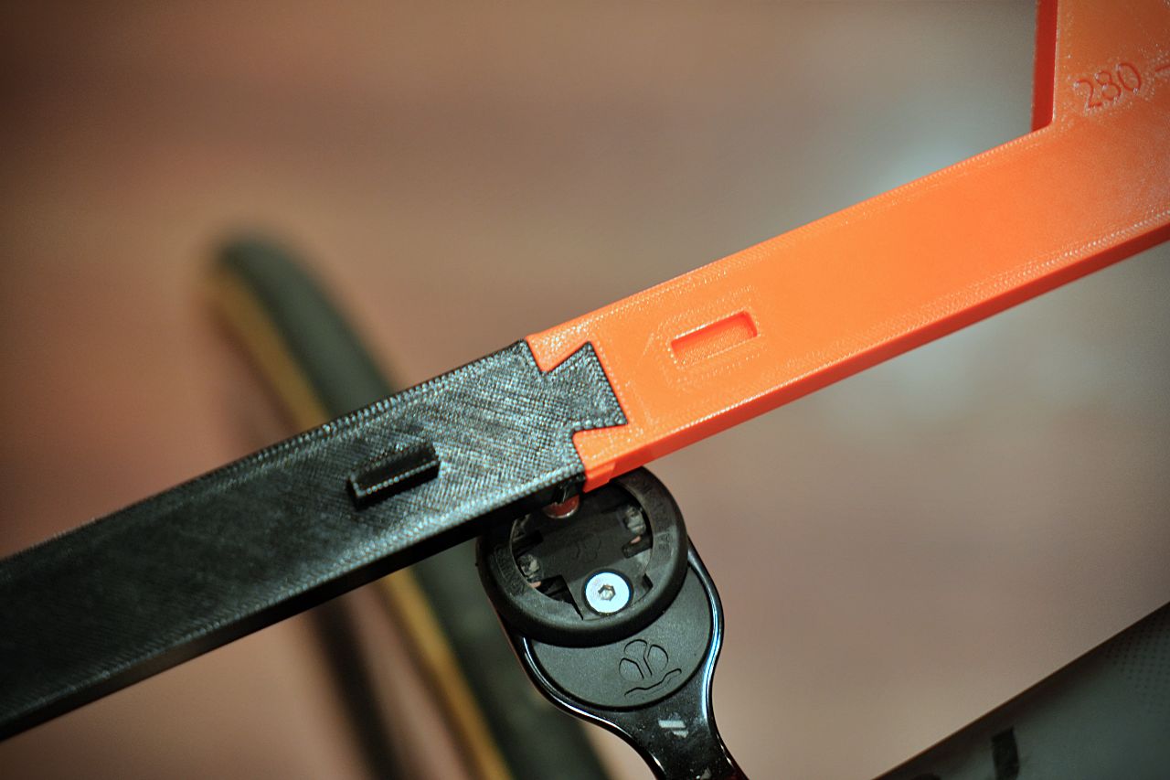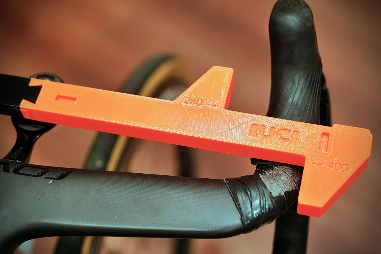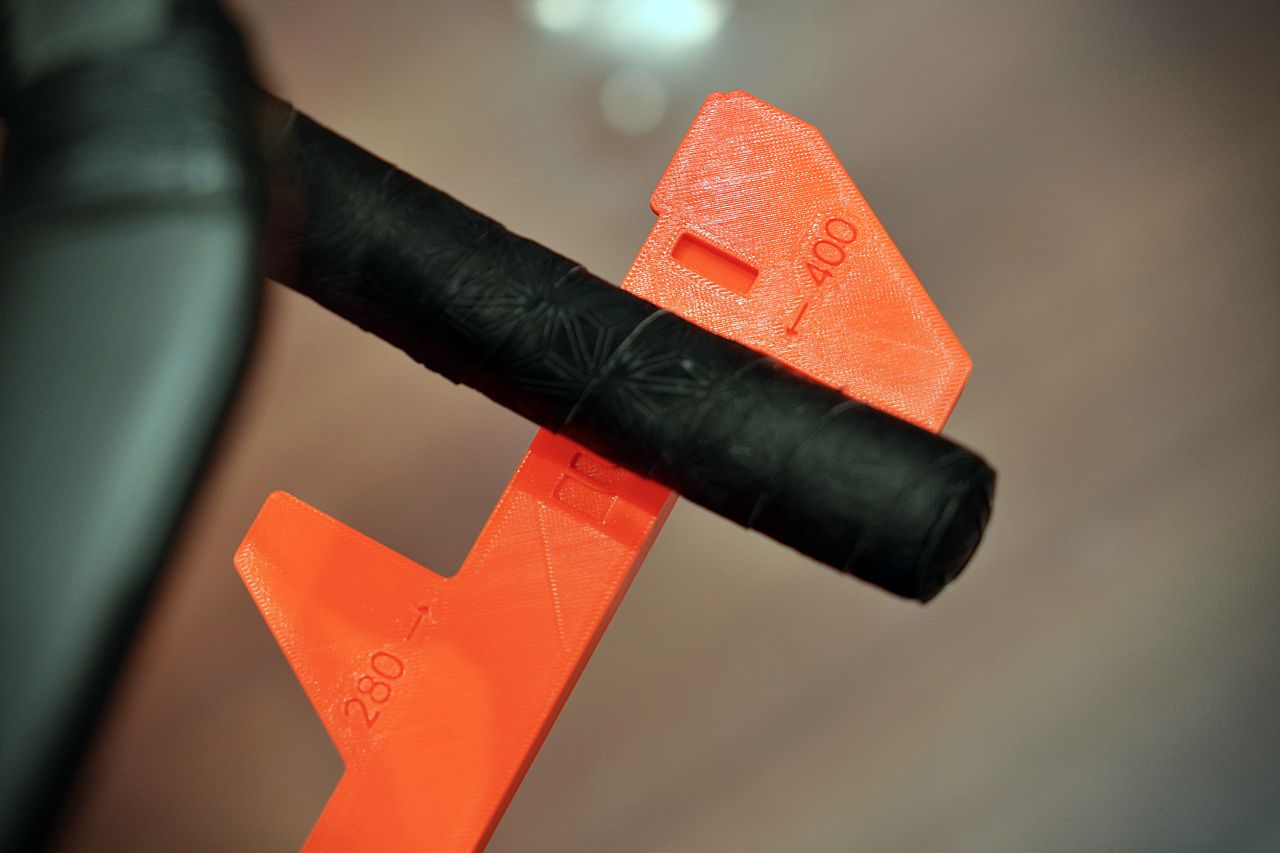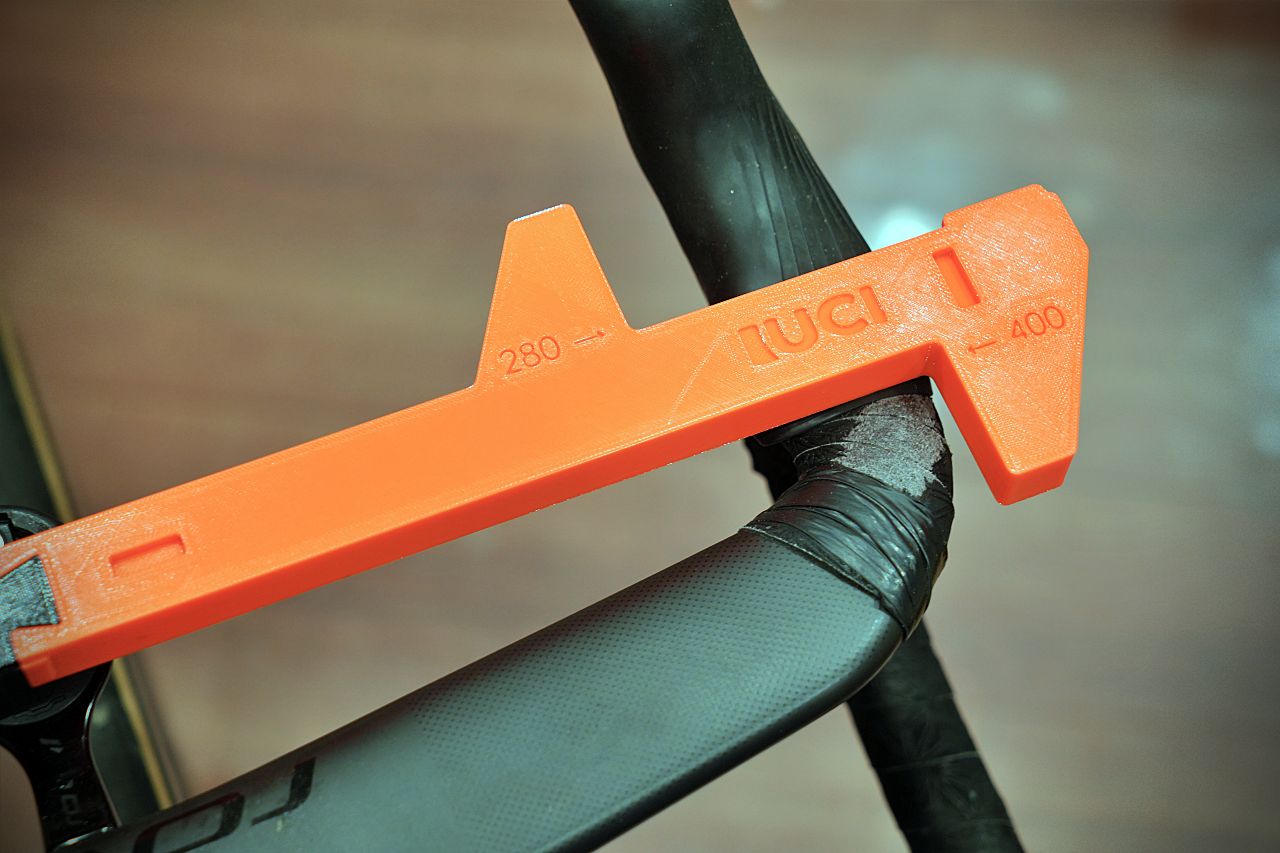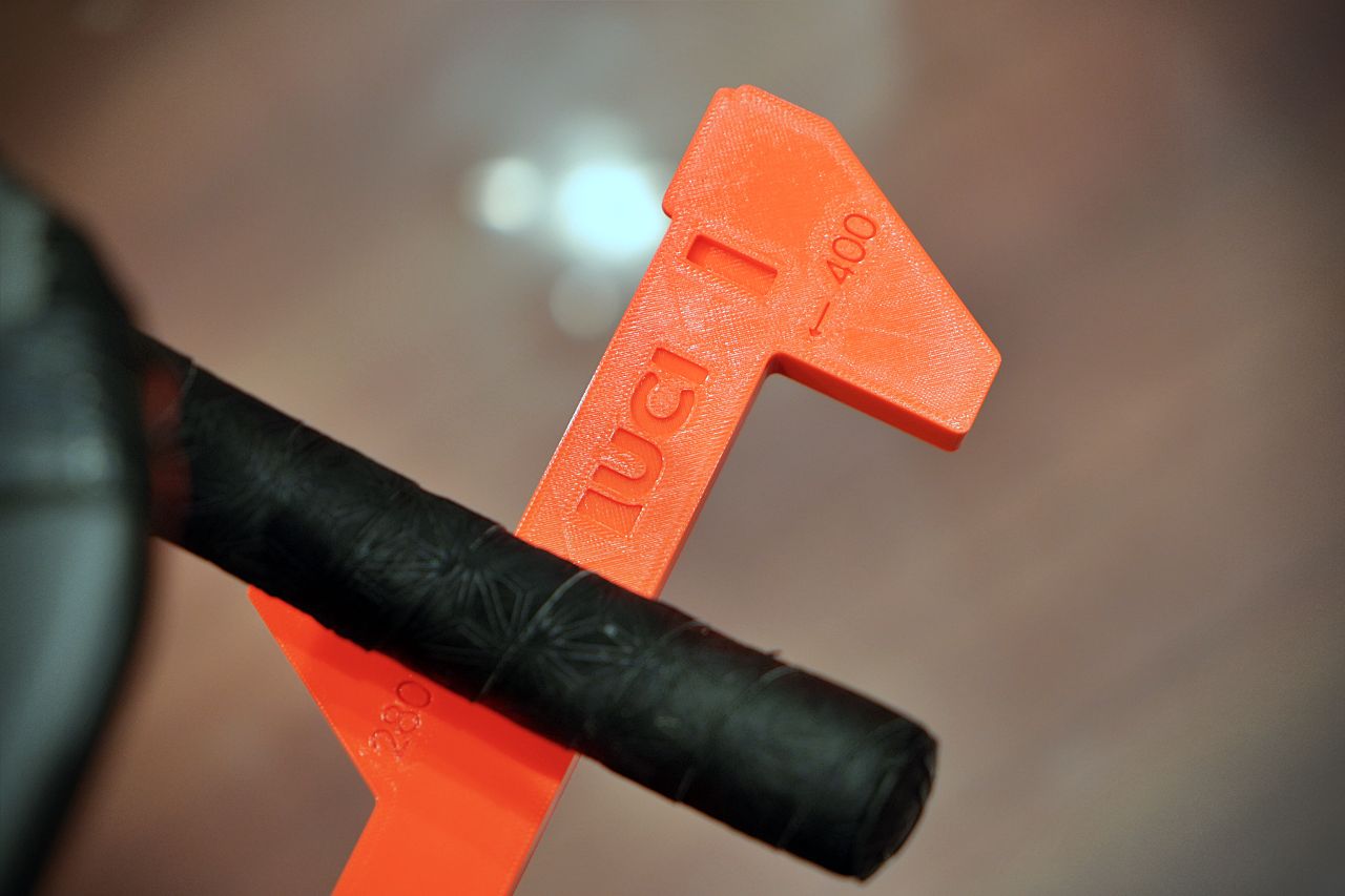 UCIの規則に基づき、ハンドルバーの最小幅、ブレーキレバーの内側への傾き(フレア角)を検査するための「コミッセール・ゲージ」です。