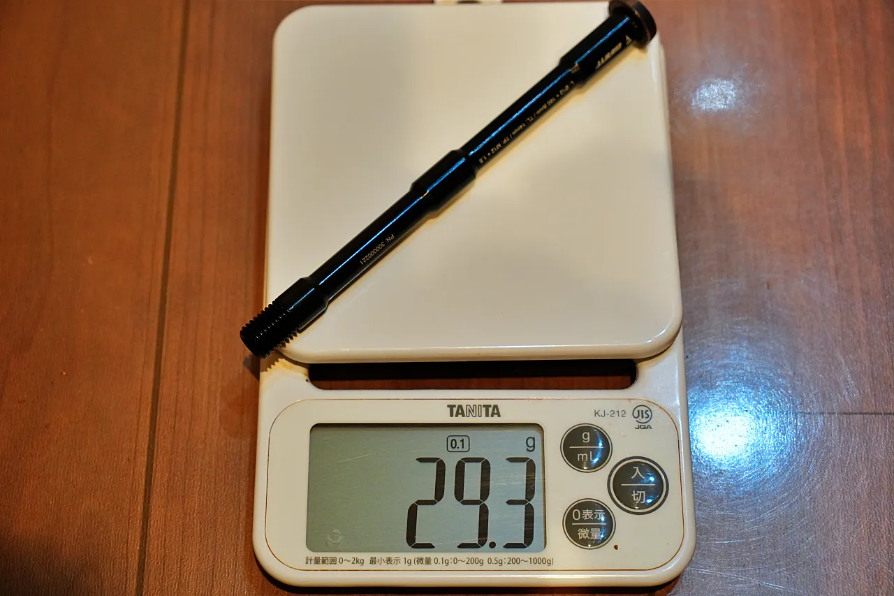 GIANTの完成車に標準装備されているスルーアクスルは、前後セットで約72gである。対して、本製品「Lightweight Road Thru Axle」は51.4gを実現しており、21gの軽量化(約29%の削減)を達成している。