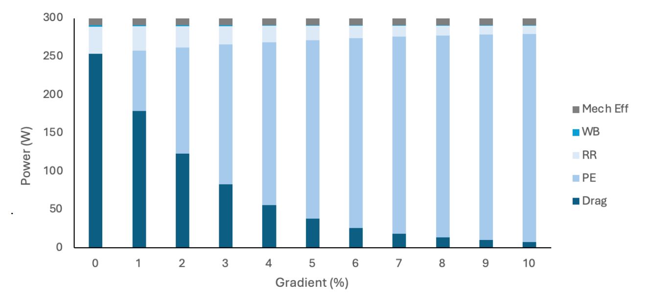 勾配がきつくなるにつれて登坂抵抗(P_PE)が支配的になるが、プロレベルのライダーは高いパワーウェイトレシオによって登りでも高い速度を維持するため、登坂中であっても空力性能の恩恵は有効であり続ける。