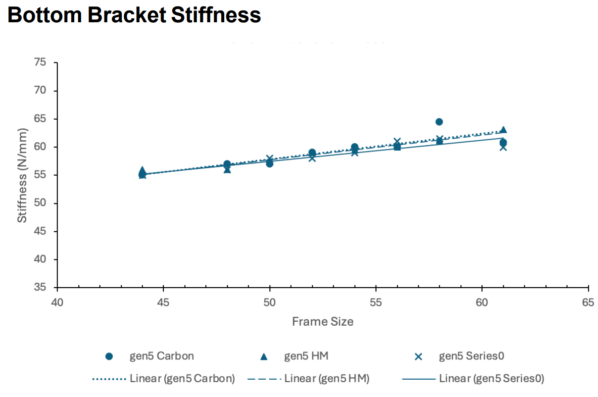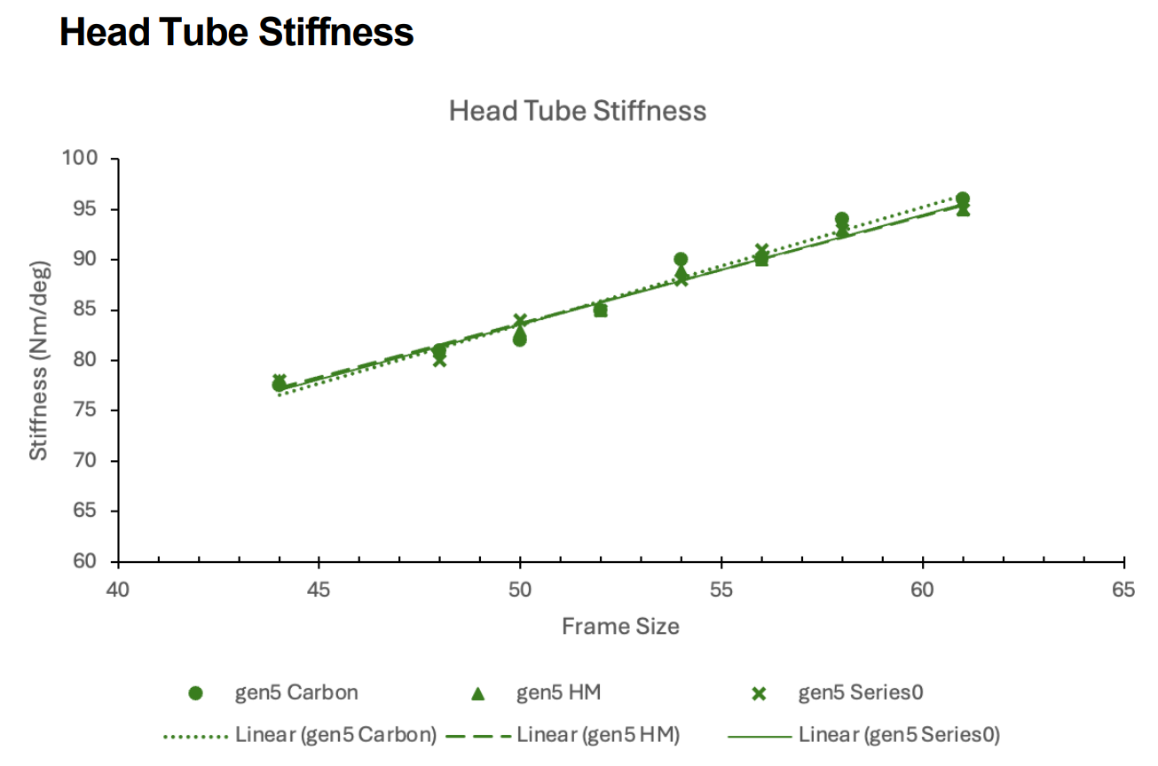 同一の剛性値とハンドリング特性を実現しており、3種類のカーボンレイアップにおいて、ヘッドチューブ剛性やボトムブラケット剛性に差を設けていない。
