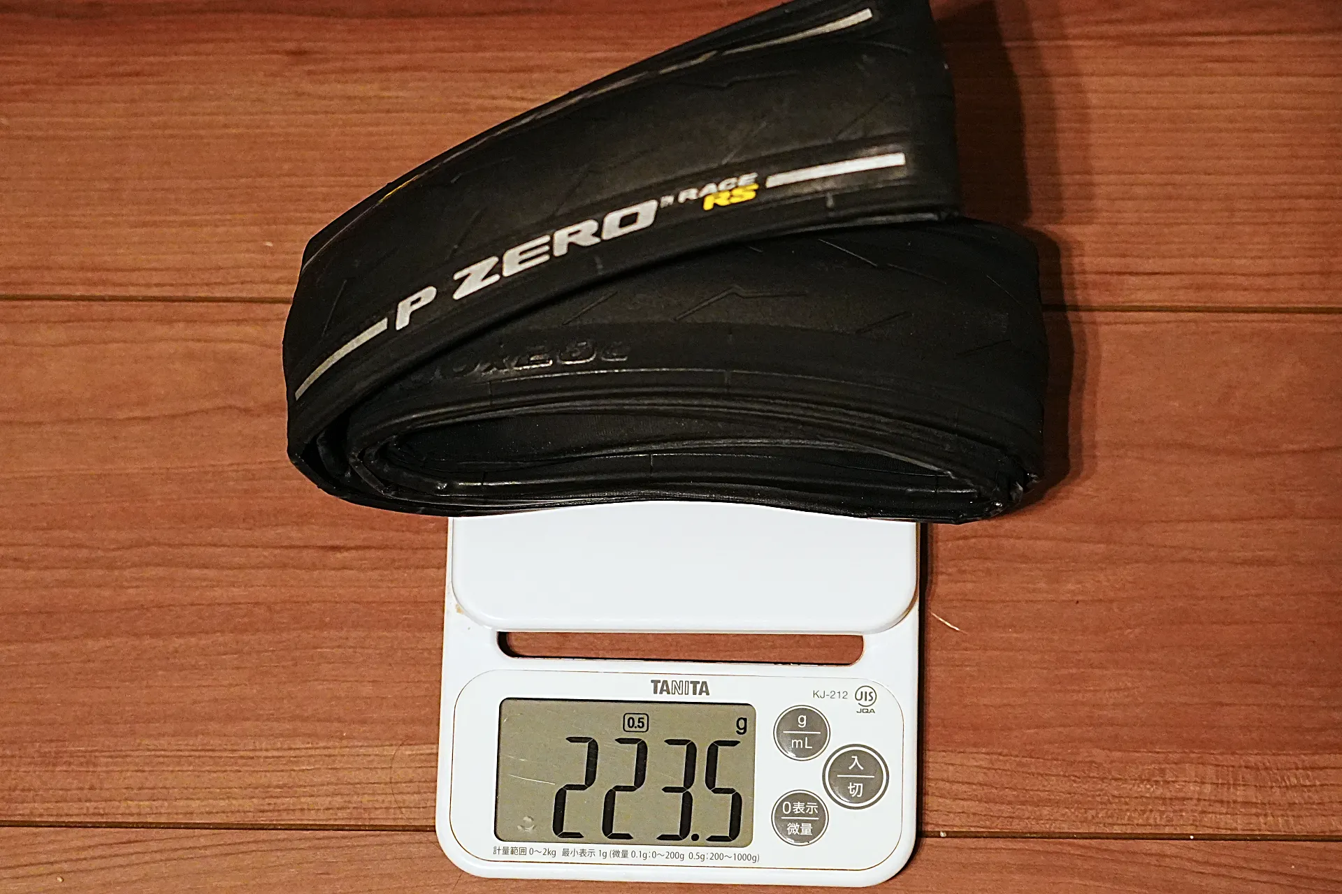 28mm幅のP ZERO Race RS(チューブタイプ)223.5g + SmarTUBE EVO(60mmバルブ)34.6g = 合計258.1g/本である。一方、28mm幅のP ZERO Race TLR RS(チューブレスレディ)290g + シーラント最低30g + 軽量チューブレスバルブ8g = 合計約328g/本となる。