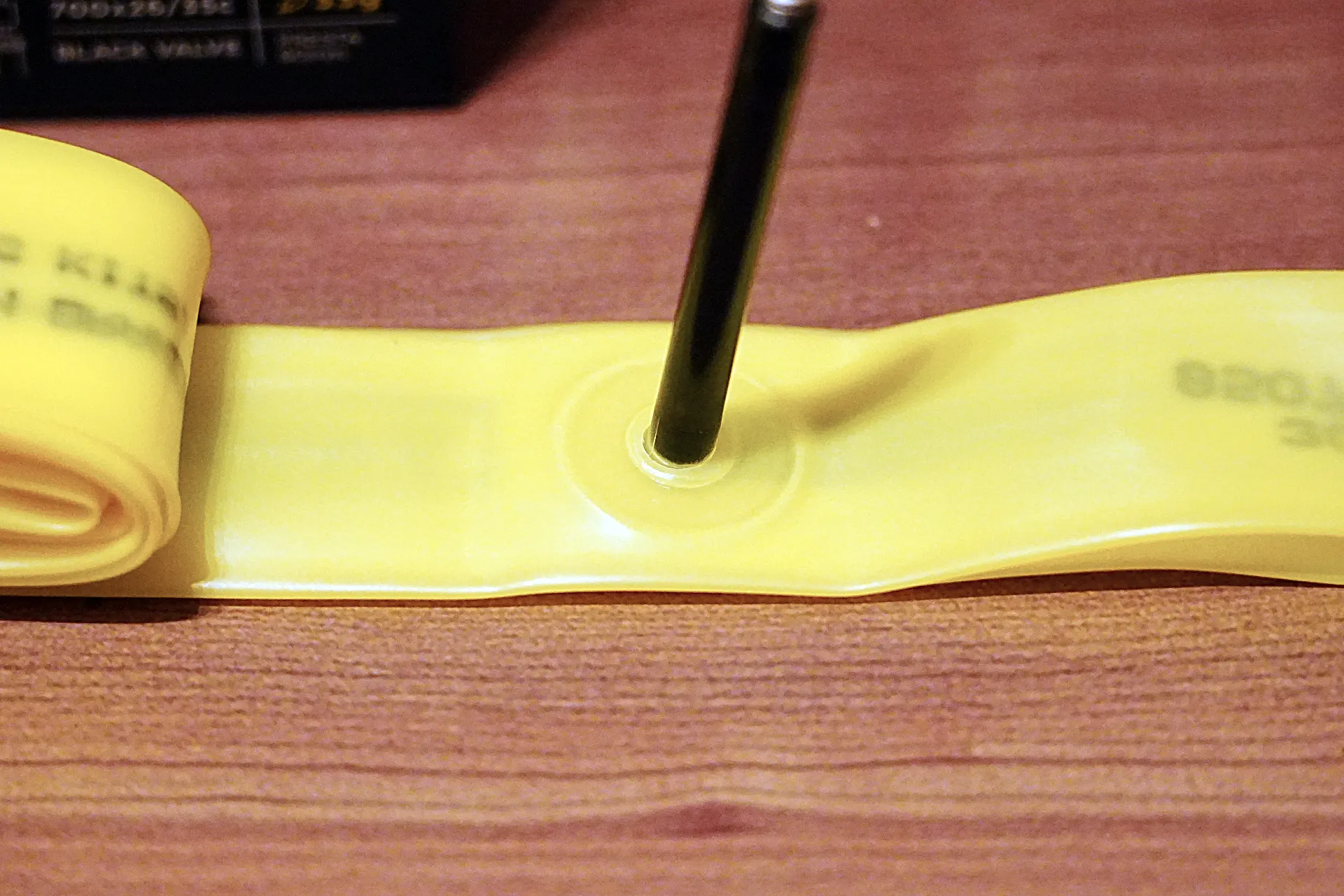 - パンク箇所を特定する。通常のチューブと同様に空気を入れて水に浸すか、耳で空気漏れ音を確認する。