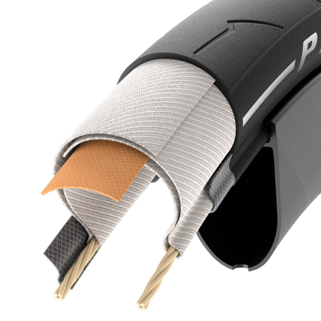 P ZERO RACE RSクリンチャーは、120TPIのナイロンケーシングにトレッド下の耐パンクナイロン補強層(TechBELT ROAD)を組み合わせた構造を採用する。