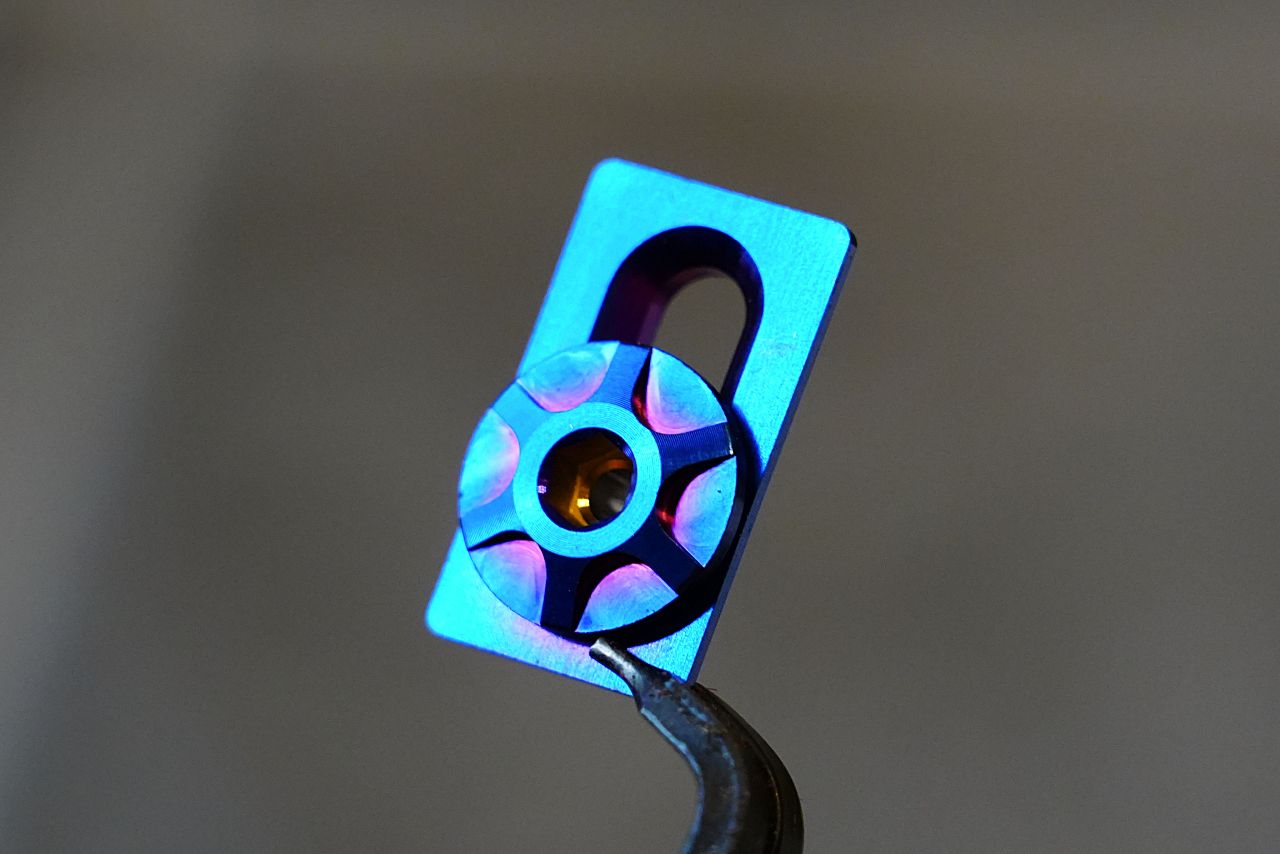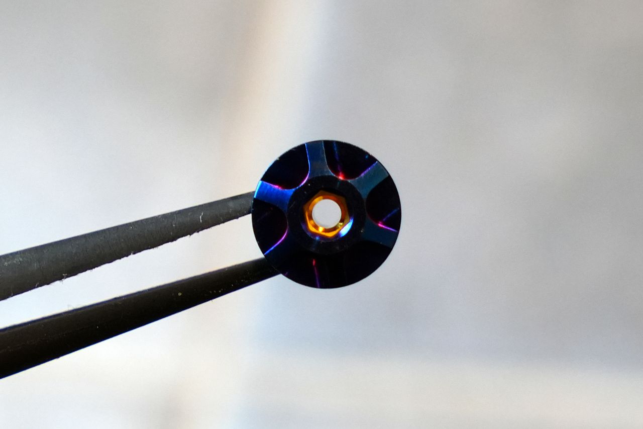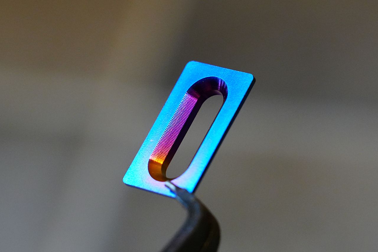 焼きチタン特有の虹彩色は視覚的な識別を容易にするだけでなく、ボルト・プレート単体としての「モノとしての完成度」も高められています。