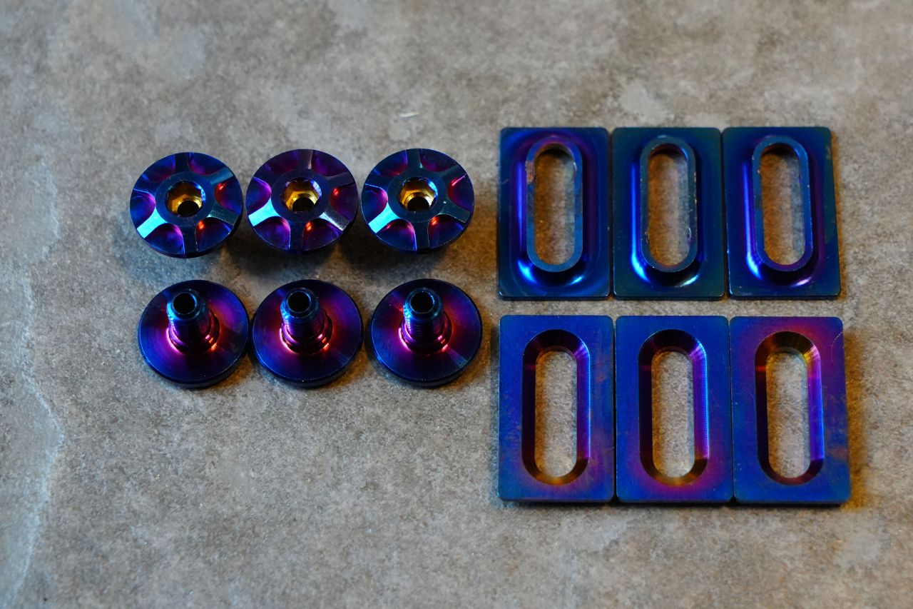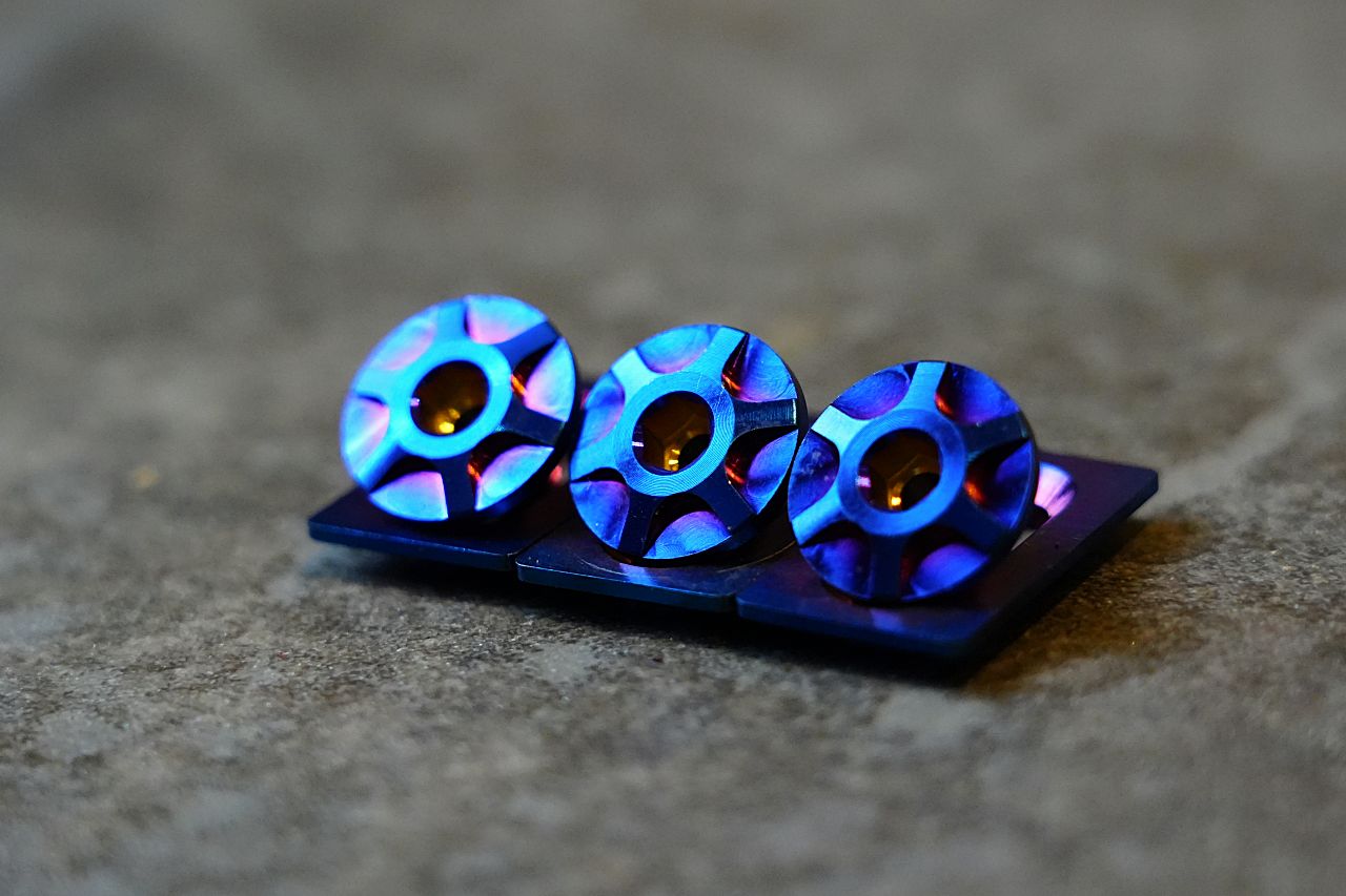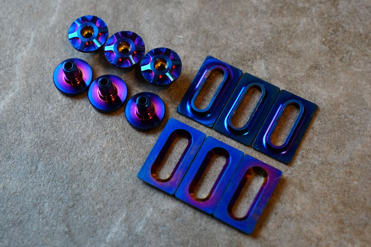 焼きチタン特有の虹彩色は視覚的な識別を容易にするだけでなく、ボルト・プレート単体としての「モノとしての完成度」も高められています。