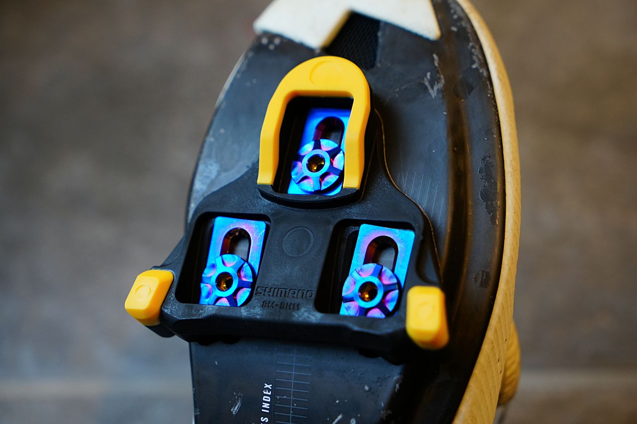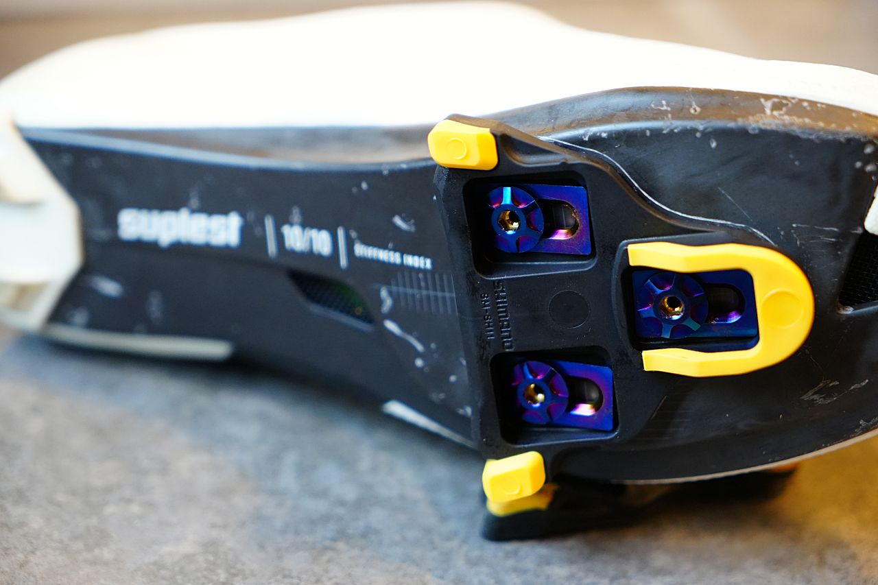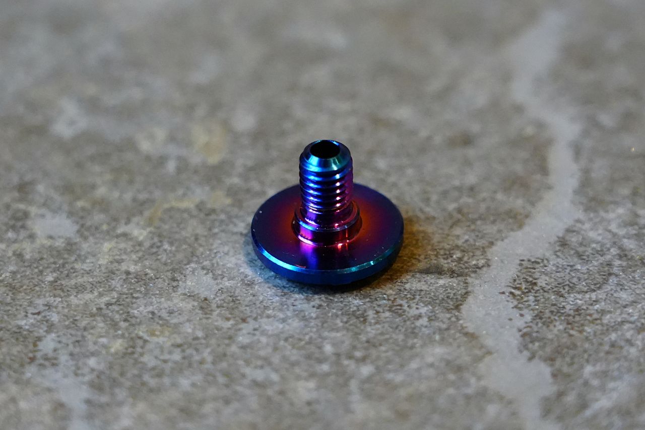 カラーはアノダイズ加工による焼きチタン仕上げを施しました。定番のシルバーカラーは純正品と見た目が近似しており、クリート交換時に(チタンボルトを使っていることを忘れて)誤って廃棄するリスクを減らせます。