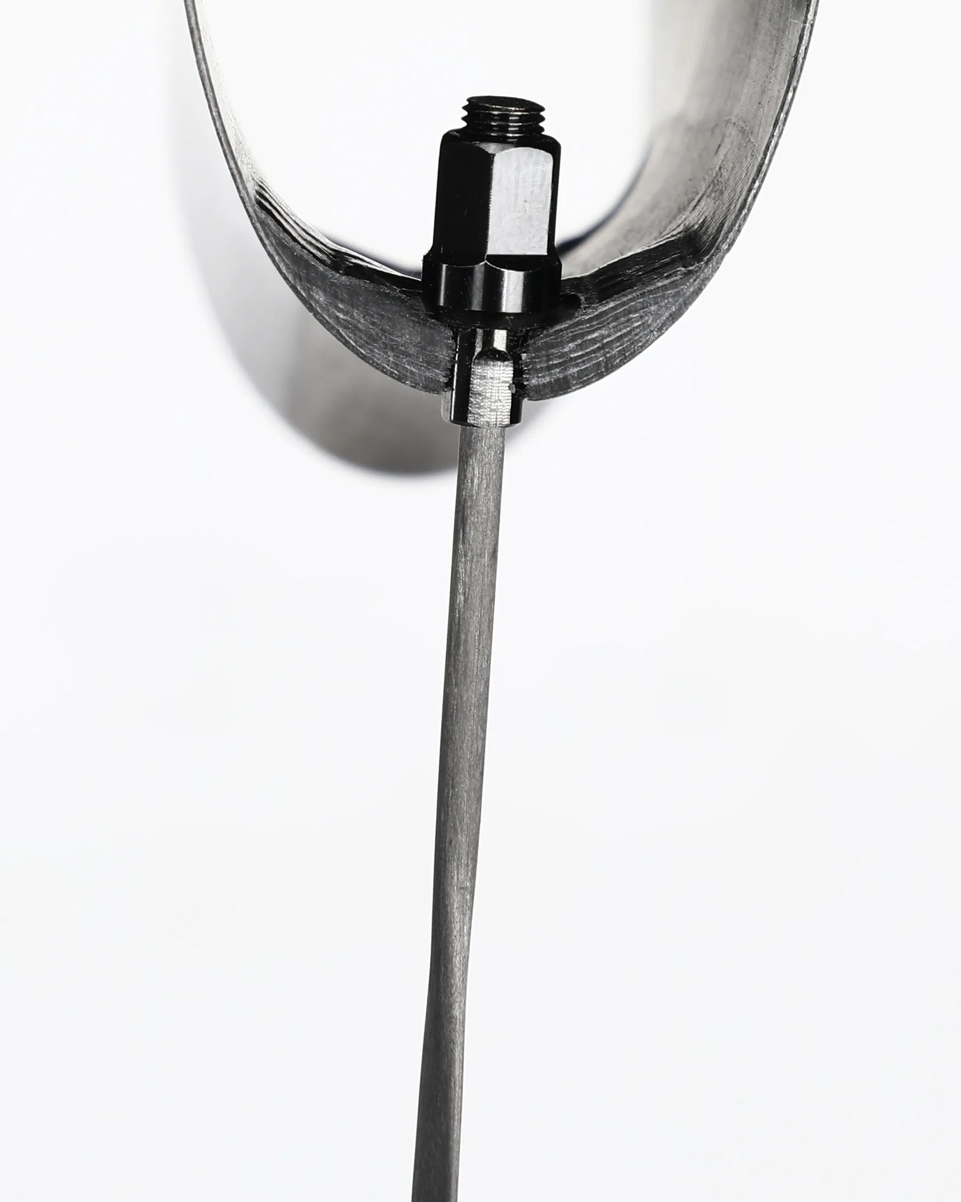 カーボンスポークは金属のように塑性変形しないため、単一の固定点に応力が集中すると破断に至る。貫通構造は、この応力集中を避ける冗長設計だ。